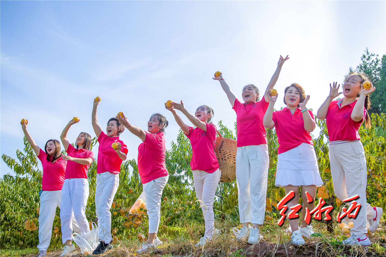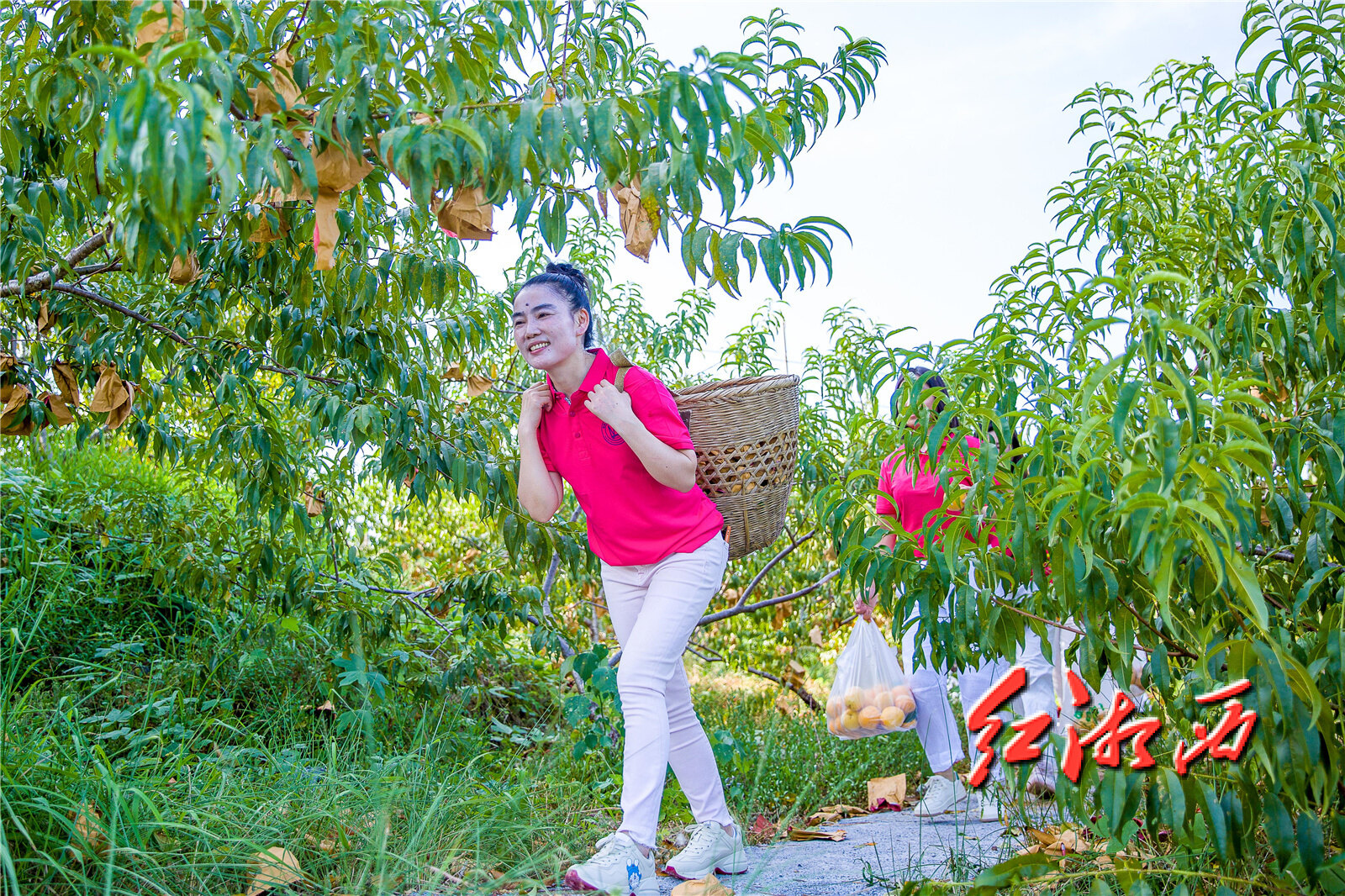 湘西州女企业家协会会长罗军和会员们一起帮助果农采摘黄桃。本组图片均由团结报全媒体记者 杨贤清 摄