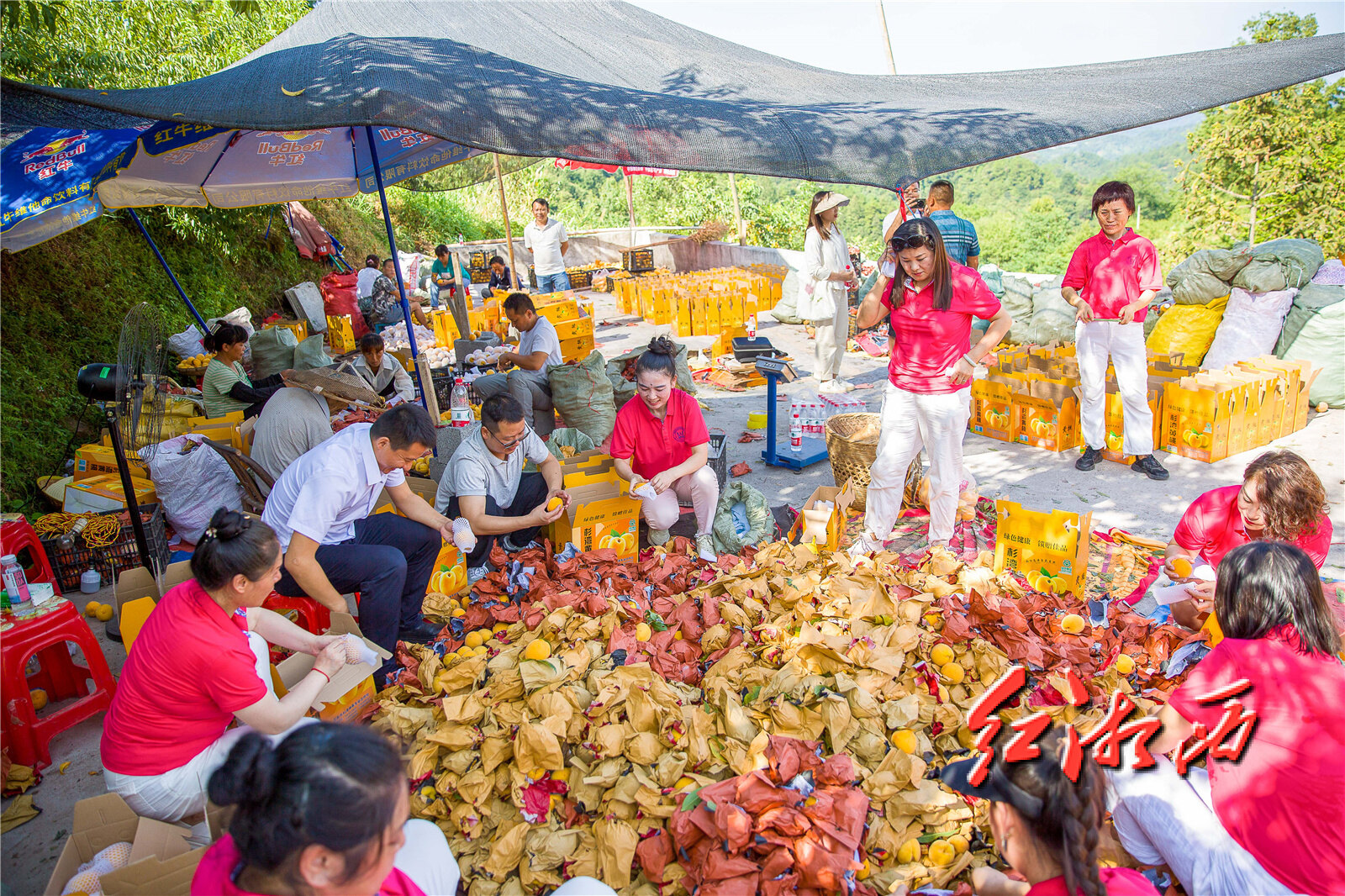在果香四溢的黄桃园里,罗军带领协会会员帮助村民们采摘、称重、包装、装车,现场一派忙碌的丰收景象。