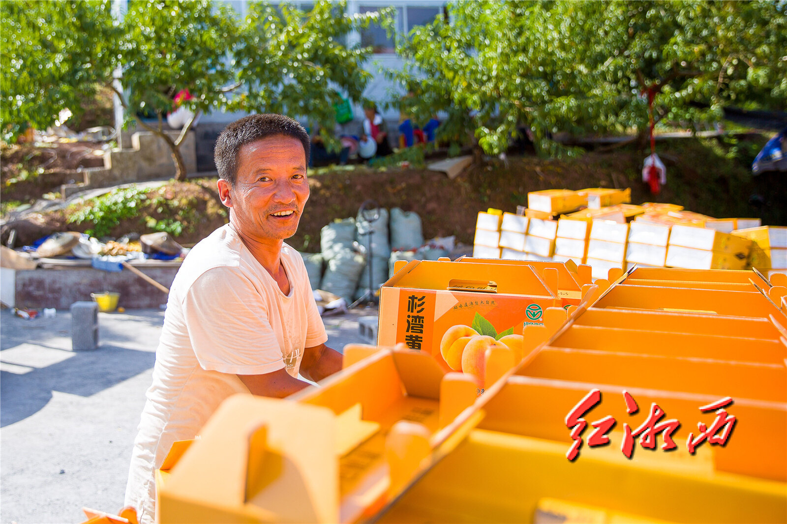 合作社社员张明红正在装车,他笑着说:今天黄桃都卖出去了很开心!以后要把黄桃种得更好,欢迎大家明年再来吃黄桃。