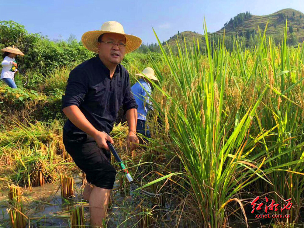9月17日,花垣县花垣镇中寨村,该县公路建设养护中心驻村帮扶工作队和单位结对帮扶干部20余人正忙着帮助建档立卡贫困户吴水望家抢收稻谷,深受当地群众赞赏。(吴红艳 黄庆/摄)